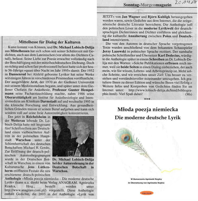 2007: Diese Anthologie soll den polnischen Leser in die moderne Lyrikwelt der deutschsprachigen Dichter und Dichterinnen einführen und gleichzeitig die kulturelle Annäherung zwischen Polen und Deutschland intensivieren. Damit der Austausch zwischen deutschen und polnischen Literaturliebhabern stattfindet, hat der Verlag ANAGRAM die Anthologie auf polnisch und auf deutsch gestaltet. Das deutsch-polnische Buch ist demnach auch an den deutschsprachigen Leser gerichtet, der in dem Band bekannte Autoren und Autorinnen neben weniger bekannten findet. Diese Anthologie steht unter der Schirmherrschaft des Botschafters der Bundesrepublik Deutschland in Warschau, Michael H. Gerdts. Ihre Veröffentlichung wird u.a. vom Goethe-Institut gefördert. |